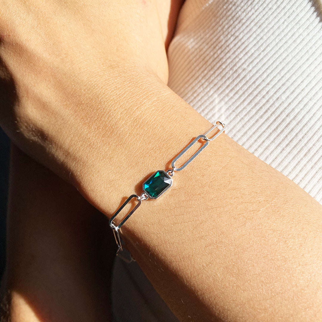 This May birthstone bracelet is a delicate sterling silver design with a modern, understated feel. It features a contemporary elongated link chain, finished with a faceted emerald-coloured baguette cubic zirconia at the centre.