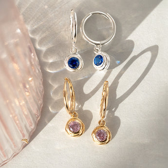 These delicate hoops have faceted round birthstones nestled in textured settings which are freely suspended so that the birthstones will sparkle when the light catches them. The earrings are available in either classic sterling silver or 14k gold plated sterling silver settings, and 12 birthstone colours.
