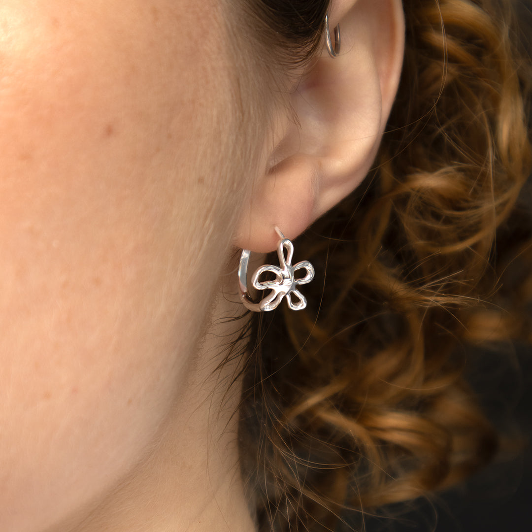 These silver flower hoop earrings feature sculptural open flower details with a softly molten, organic look. Each hoop carries a flower motif formed from rounded silver petals, creating a modern design that feels both natural and eye-catching.