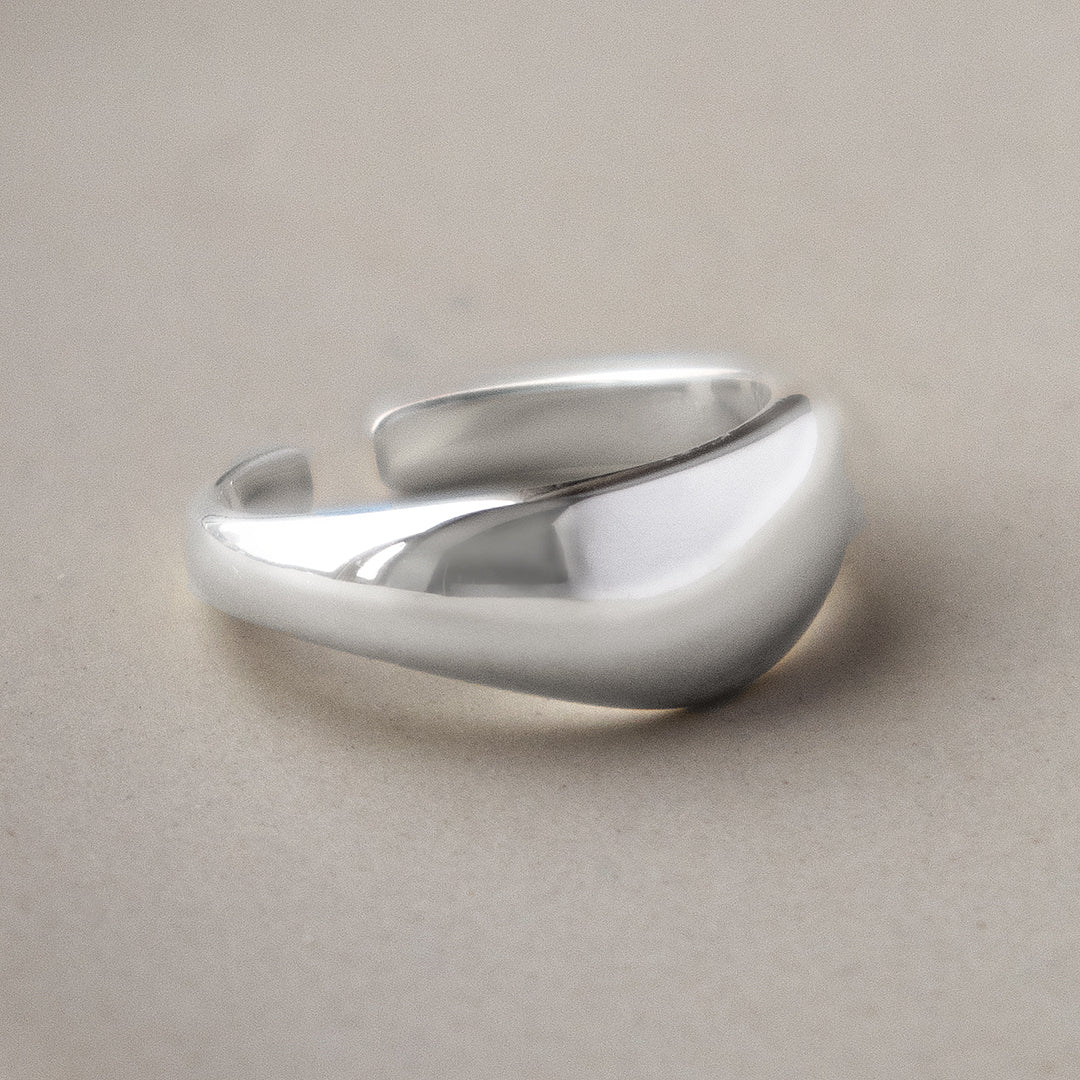 This chunky silver ring features a flowing wave shape crafted in solid sterling silver for a bold yet modern look. The sculptural curve moves smoothly across the finger, creating a confident statement while still feeling wearable every day.