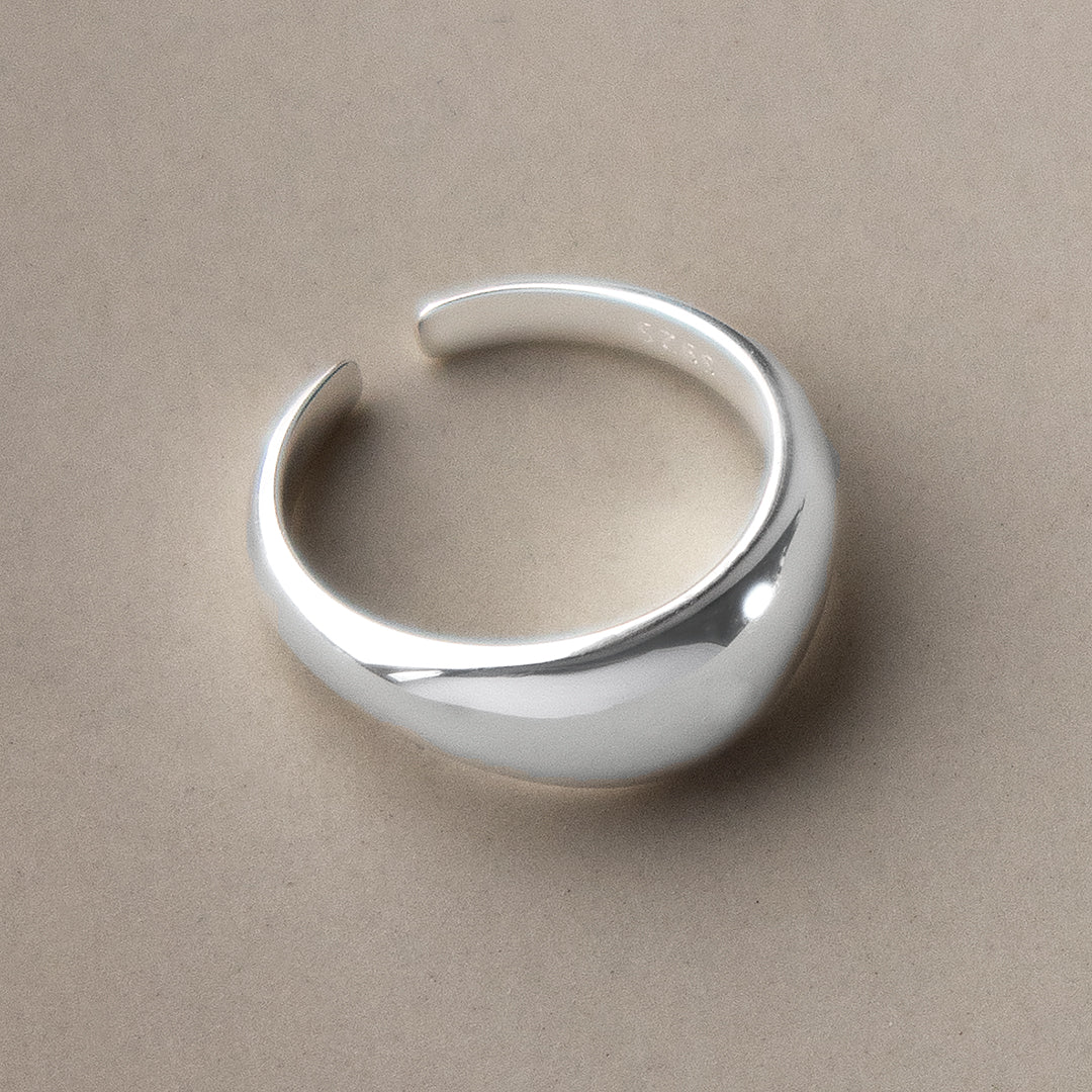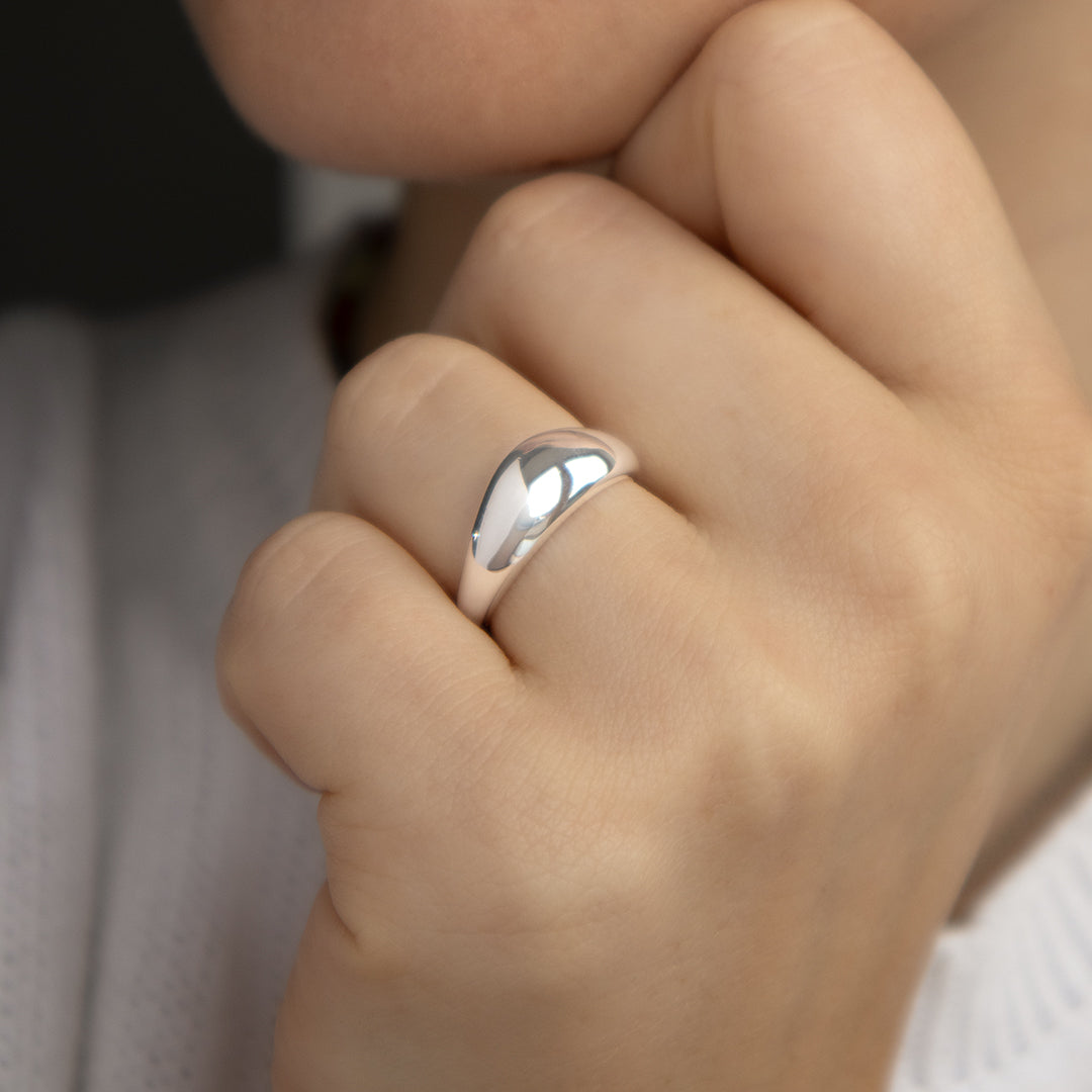 The dome-style wave rises at the centre and gently tapers towards the band, giving the ring satisfying weight while keeping it comfortable to wear. The polished finish reflects light beautifully, so the design feels clean and contemporary rather than heavy.