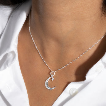 Crafted in sterling silver, it features a crescent moon and a tiny star. The necklace comes with a fine chain in your choice of 41cm, 45cm, or 50cm. Wear it on its own or layer it with your favourites.